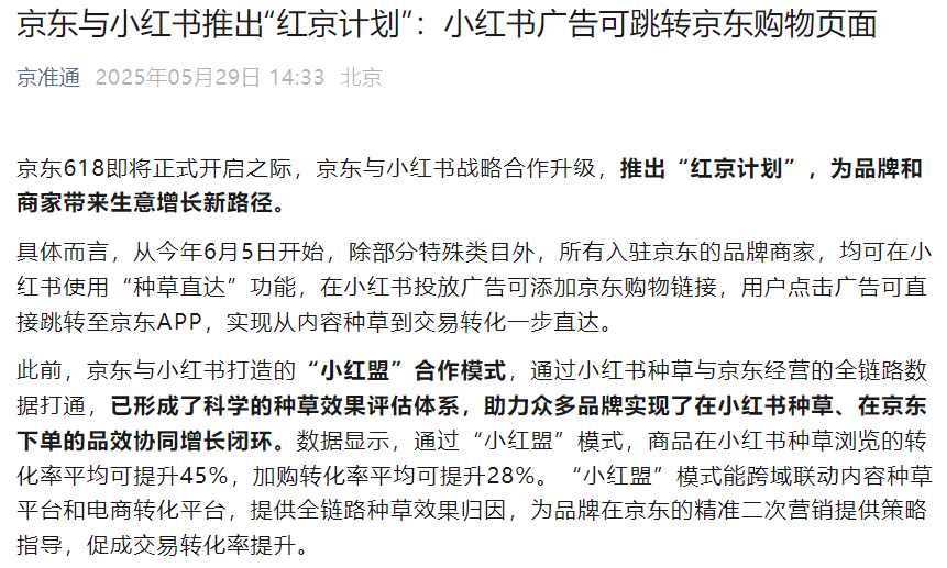 5月29日,京準通發(fā)文稱,京東與小紅書戰(zhàn)略合作升級,推出“紅京計劃”。