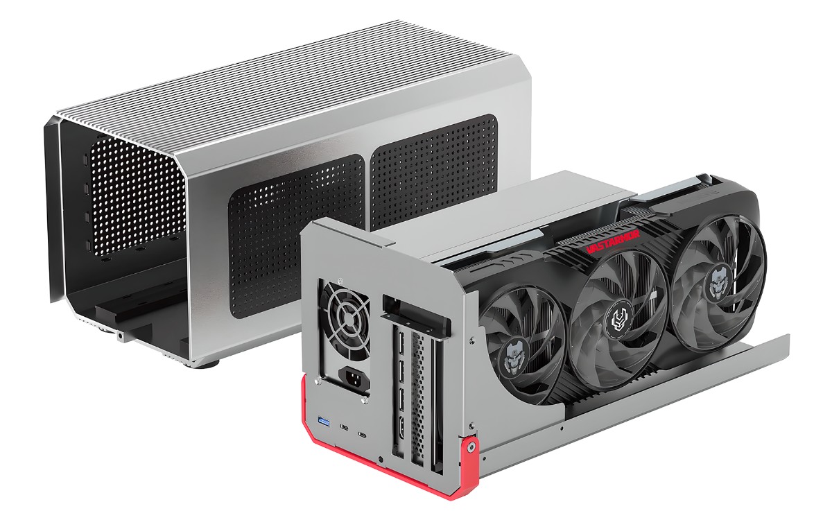 IT之家獲悉,VST3D01 顯卡塢三維 384×182.7×192.7 (mm),采用鋁合金 + ABS 材質,提供 3 槽寬度的顯卡 I/O 擋板。其 I/O 接口均位于尾部,提供了一對雷電 4 / USB4 40Gbps 上下行接口和一個下行 USB-A 10Gbps。
