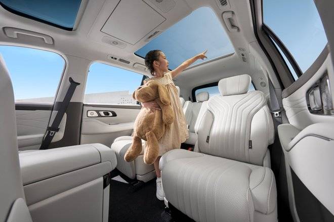 大空間之中,吉利銀河M9做到了三排都舒適的乘坐體驗,一排主駕配備同級獨有轉向自適應側翼支撐、自適應腰托,副駕配備無縫腿托“寵愛椅”,有排面更體面;二排高清娛樂屏、 9.1L智能冷暖冰箱、隱藏式杯托,完備的奢享座椅配置,尊貴舒適更講究;三排全尺寸舒適座椅,擁有同級最大150°躺倒角度,配合0.15㎡勃朗峰舷窗,同級最大,通透敞亮。