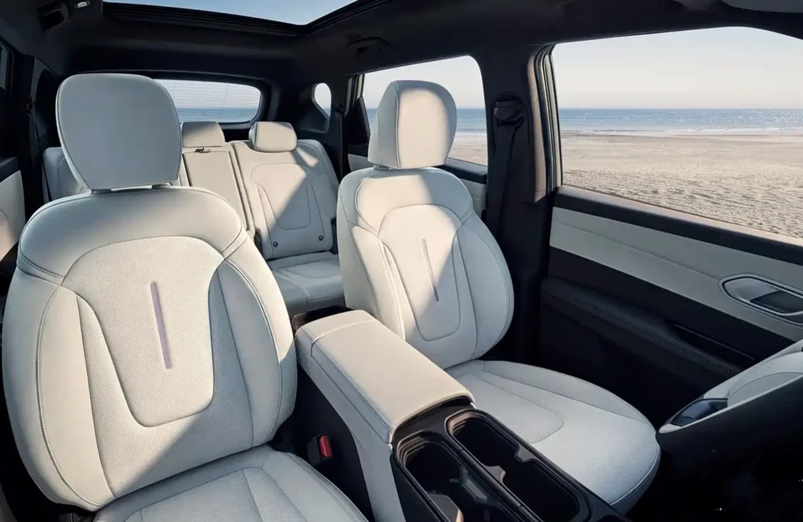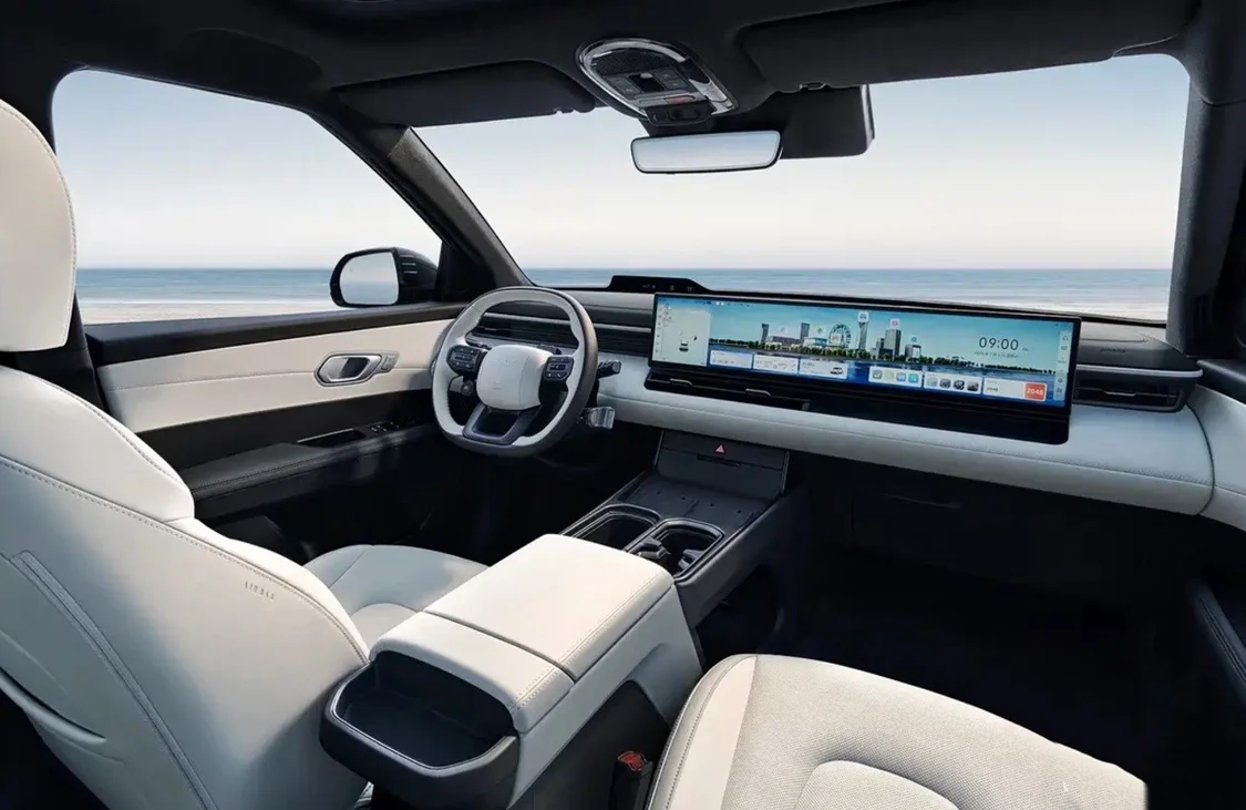 該車內飾采用大尺寸中控屏 + 副駕娛樂屏組成的 27 英寸一體式連屏設計,中控臺取消了傳統物理按鍵,同時標配 HUD 系統,支持普通 / 極簡 / 地圖三種顯像模式自由切換。車輛匹配三輻式多功能方向盤,方向盤后側設計了兩個換擋撥片,撥動撥片即可切換 4 檔動能回收模式,長按撥片還能激活單踏板模式與 AUTO 自動回收模式。