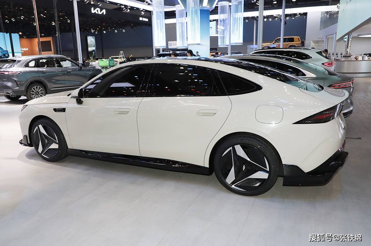 車身側面部分的造型很舒展流暢,車身腰線很柔和,車門把手使用了半隱藏式設計,車身下包圍使用了黑色涂裝,輪轂為封閉式風格,雙色涂裝很炫酷。